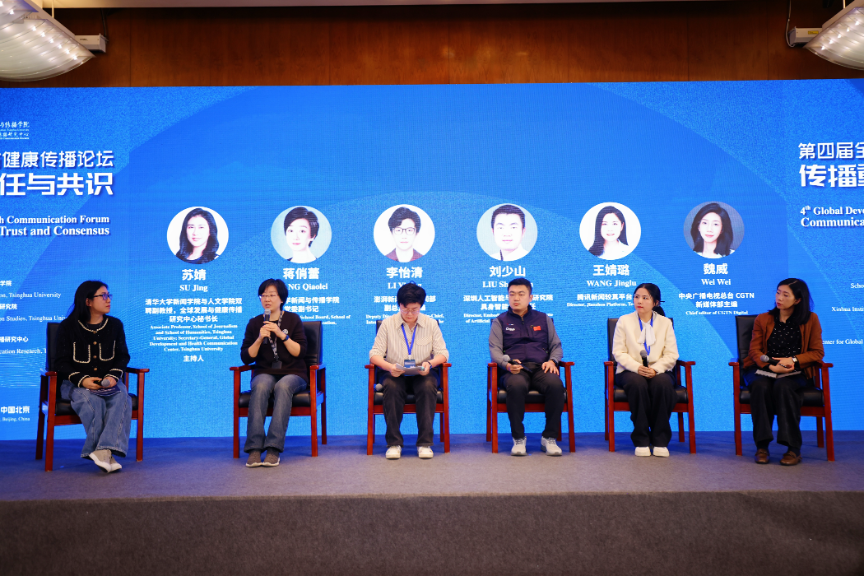 此后的圆桌讨论环节,清华大学新闻与传播学院蒋俏蕾教授、中央广播电视总台CGTN新媒体部主编魏威、澎湃新闻国际新闻部副总监兼主编李怡清、腾讯新闻较真平台总监王婧璐,以及深圳市人工智能与机器人研究院具身智能中心主任刘少山从虚假信息识别与媒介伦理等角度,探讨了AI与传播之间的平衡与边界。