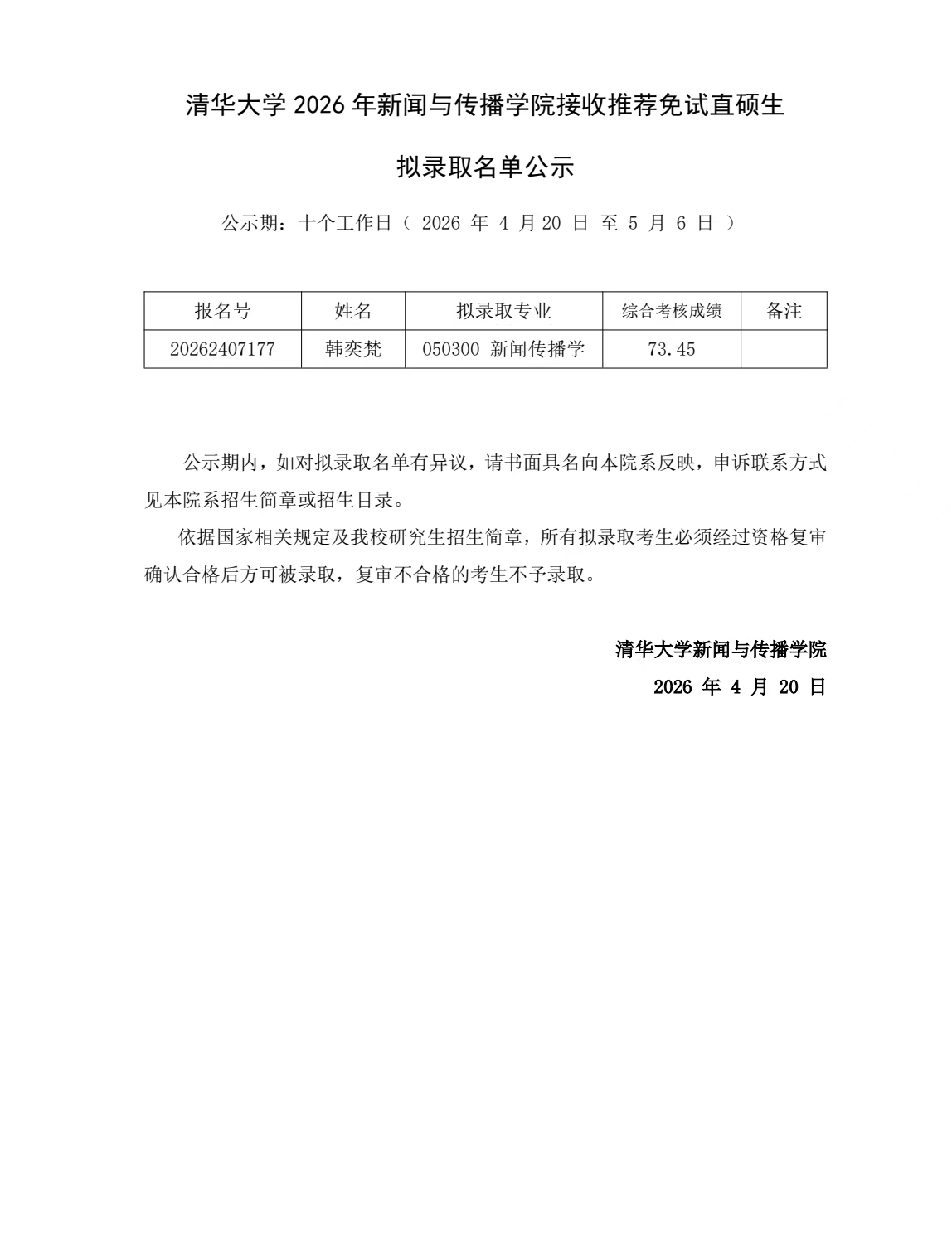 下一条:清华大学2026年新闻与传播学院硕士研究生拟录取名单公示